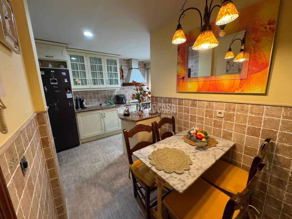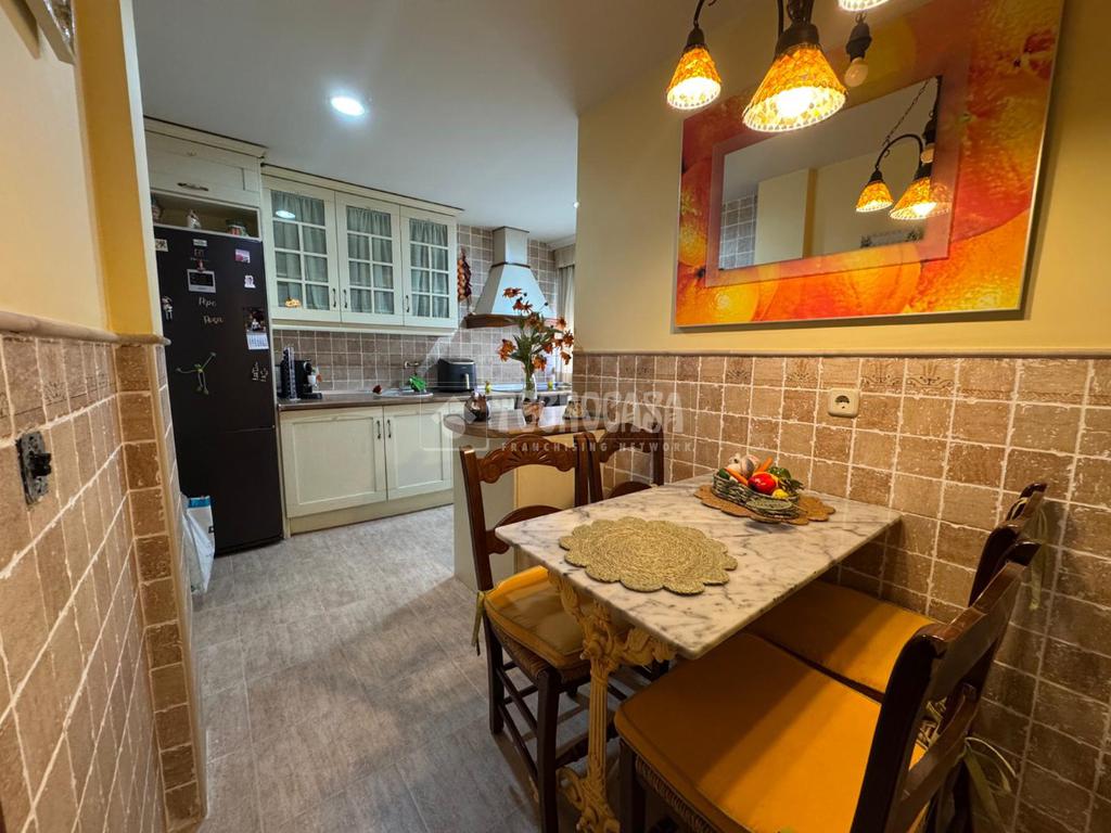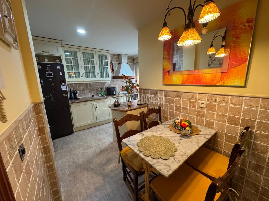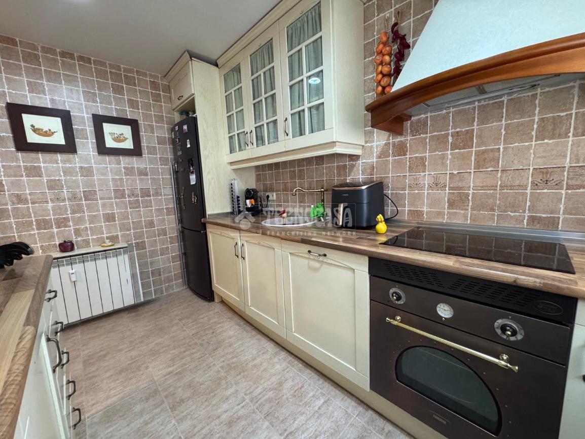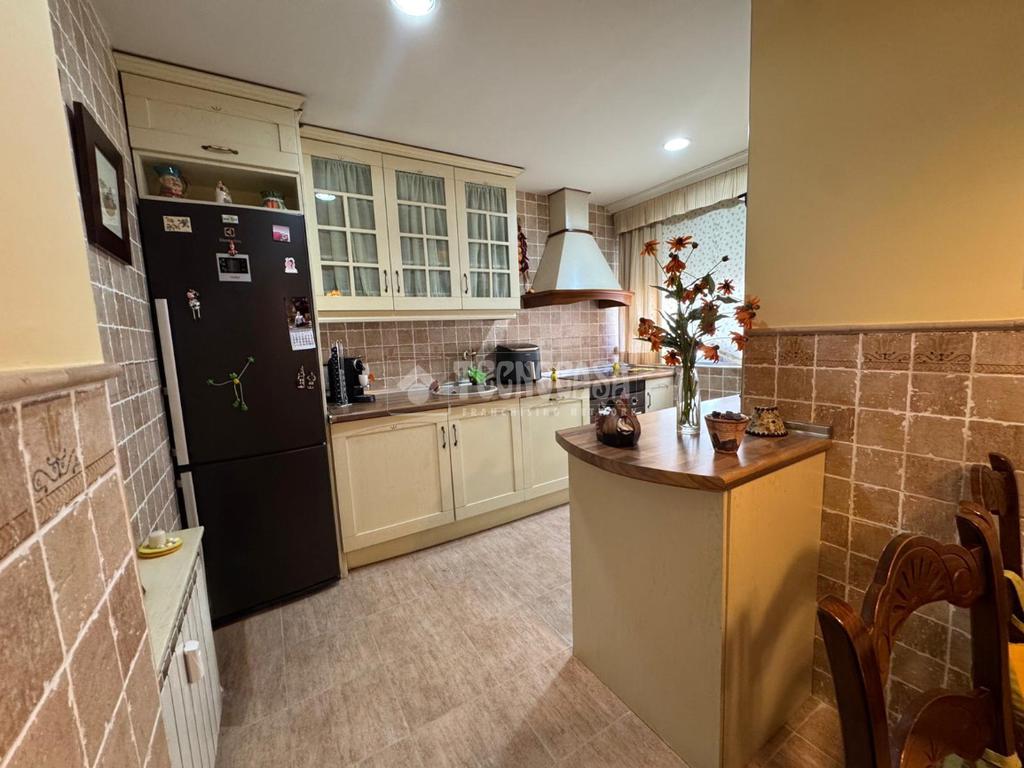 Cocina amplia totalmente reformada, con acabados de madera en la encimera y en la campana con salida de humos, que aportan un estilo cálido y elegante. Además, cuenta con detalles en bronce en el grifo y el horno, ofreciendo un toque distintivo y sofisticado.