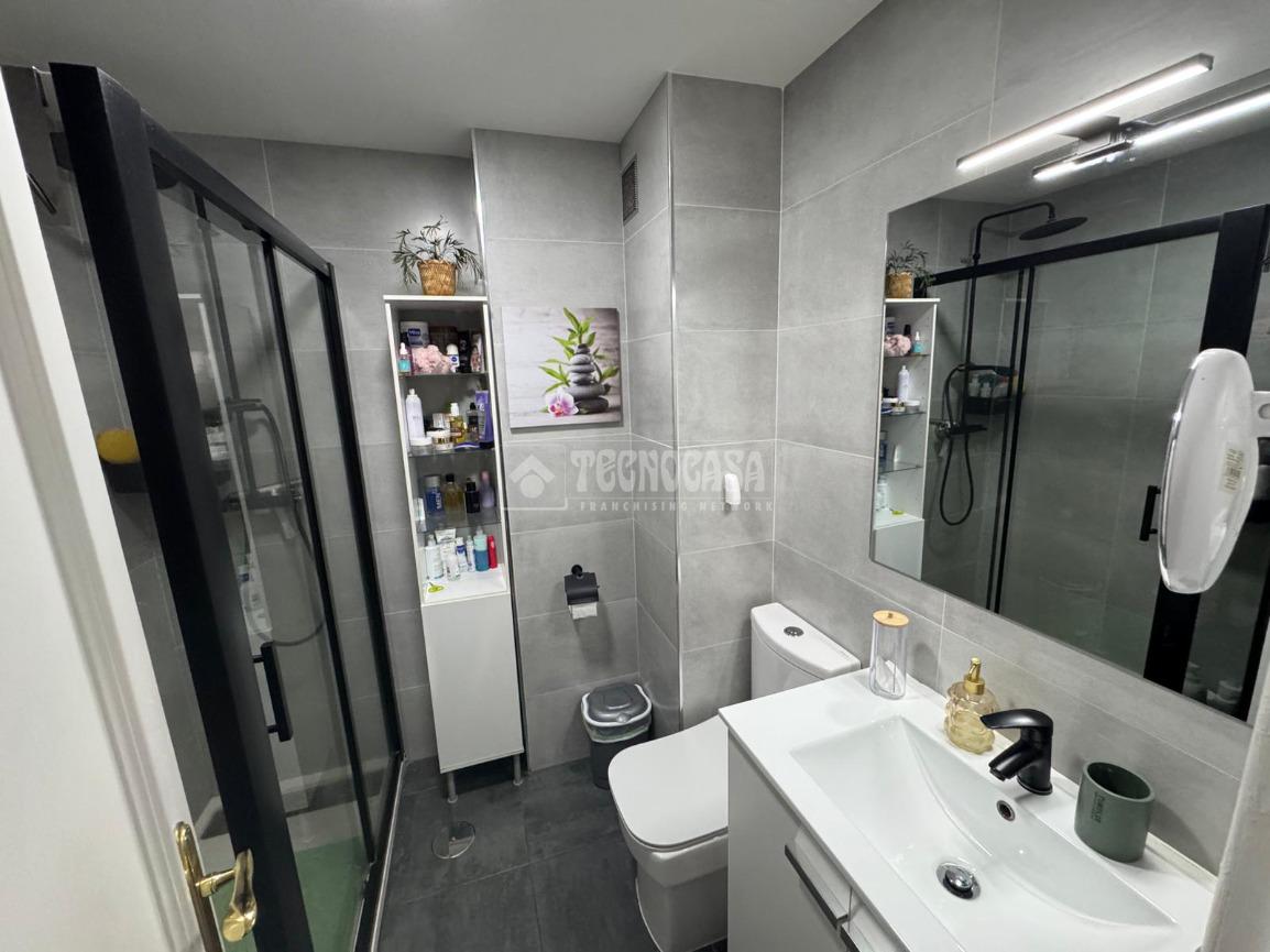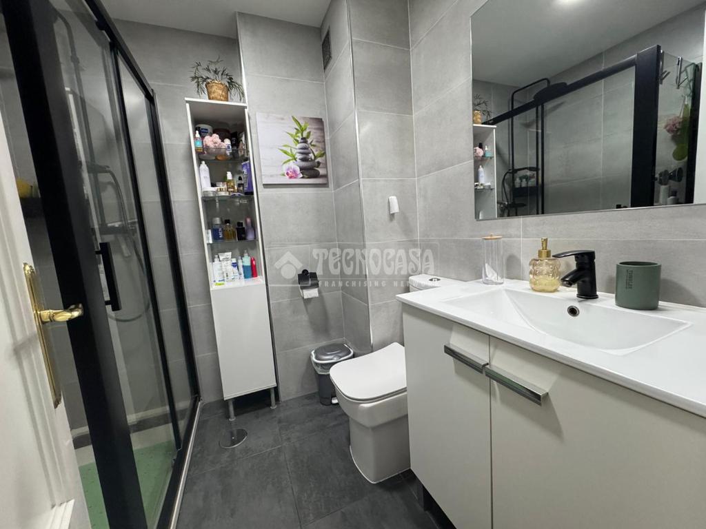 Baño completamente reformado con plato de ducha, moderno y funcional.